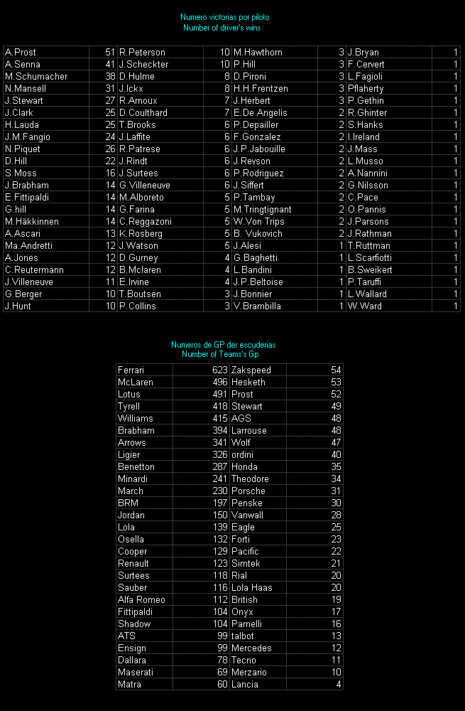 Escuderias/Teams | Los grandes rivales/The big rivals | Especial pilotos españoles/Special spanish pilots | Album de fotos/Photo's album | Estadisticas/Statistics | El mejor circuito "Montmeló"/The best circuit "Montmeló" | Links interesantes/Interesting links | Mensages/Mails
