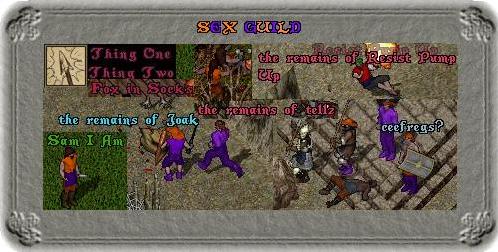 January 18, 2004 - 7:38 PM Hey guys glad you could make it today. Just wanted to say, "Welcome to the opening of the SEX guild webpage! Hopefully, this site will grow and prosper... and some day flower into a real website of some kind... unlike the rest of the websites my friends and I have made in the past which eventually turn into something resembling a flaming bag of shit. First off, for those that don't know, I just want to give a little background about us. SEX guild, (made mostly of former Chesapeake retards), currently plays on IPY Server. IPY, or In Por Ylem, is a freeshard in which you can play Ultima Online the way it was supposed to be played: Pre UO:R. Anyways, if you are interested in joing up or just checking out what IPY has to offer, go to WTFman.com to see what it is really all about. If you took equal parts Violence, Humor, and Idiocy, blended them together and digested it... that would about equate to what this guild is all about. Well that's about it for the first post from this site's creator. Pretty soon though, (as long as the ball keeps rolling), I'll move this to its own domain. - Fox |