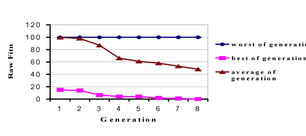 The graph shows that the best of generation converged rapidly to the solution while the average fitness of the population improved significantly. There is no improvement in the worst of generation indicating that random cross-breeding produced unfit members in each new generation.