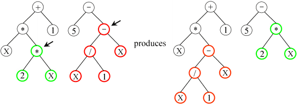 The gene type for this test was a binary tree. Cross breeding was performed by selecting random points on the two parent trees and then swapping the subtrees denoted by those two points: