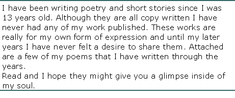 The Sound of Breaking- Again another attempt to cope with letting go. I suppose letting go is one of the things I have learned to do the best. Written in February, 1998, I found that time heals me quicker as I mature.