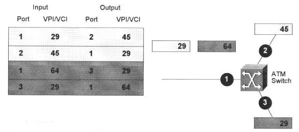 The basic operation of an ATM switch is very simple: to receive a cell across a link on a know VCI or VPI value; to look up the connection value in a local translation table to determine the outgoing port (or ports) of the connection and the new VPI/VCI value of the connection link with the appropriate connection identifiers such as the figure 3.