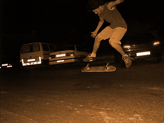 The Kickflip or Ollie Flip:In order to learn the kickflip, it is necessary that you learn the ollie. Now that you have learned it, I want you to get on your board in an ollie stance. Okay, we're going to have to alter this stance a little. Take you front foot and put it right before the front bolts. Now turn it 45 degrees. The ball of your back foot should be in the middle of your tail. Now to actually do the trick. First you gotta pop down your tail real hard, just like an ollie, so you begin to get off the ground. As you rise, you should slide your foot the way you do for an ollie, but you want to slide off the heel edge of your board also. Now you better have your feet outta the way. However you gotta do it, do it. Wait for the board to spin around, and stay well above it. When it comes around bring your feet back in and catch it. The best place for your feet to catch the board is right on top of all the bolts. You want to "catch" or "grab" it in the air with your feet, and then bend your knees a little because the ground is coming. When your board hits the ground (and you should be on it at this point...), you need to use your legs like shocks on a car, and obsorbe the landing. Ride away looking cool, because you just did one of the harder basic tricks to master. Twisted FlipThis a new trick. It is very sick when you do it off of