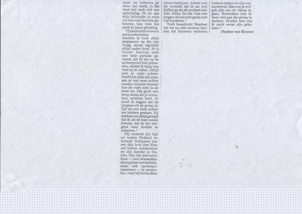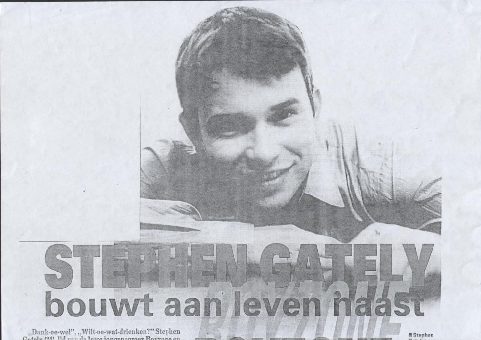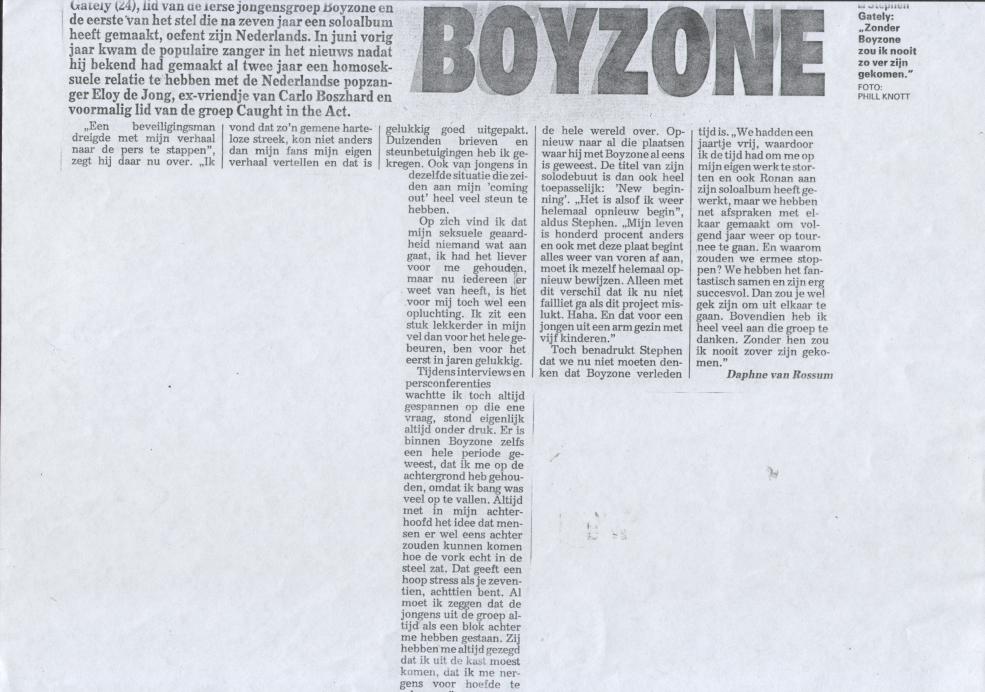"Dank-oe-wel" [me: Thank You], "Wilt-oe-wat-drienken?" [me: what would you like to drink?"] Stephen Gately (24), member of the Irish boy band Boyzone and the first after 7 years to release a solo album, practises his Dutch. In June last year, the popular singer came out in the newspapers and revealed that he has been in a relationship for 2 years with the Dutch pop singer Eloy de Jong, ex boyfriend of Carlo Boszhard and one-time member of the group Caught In The Act.