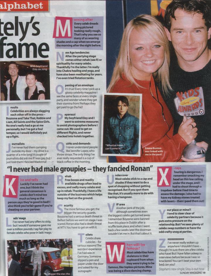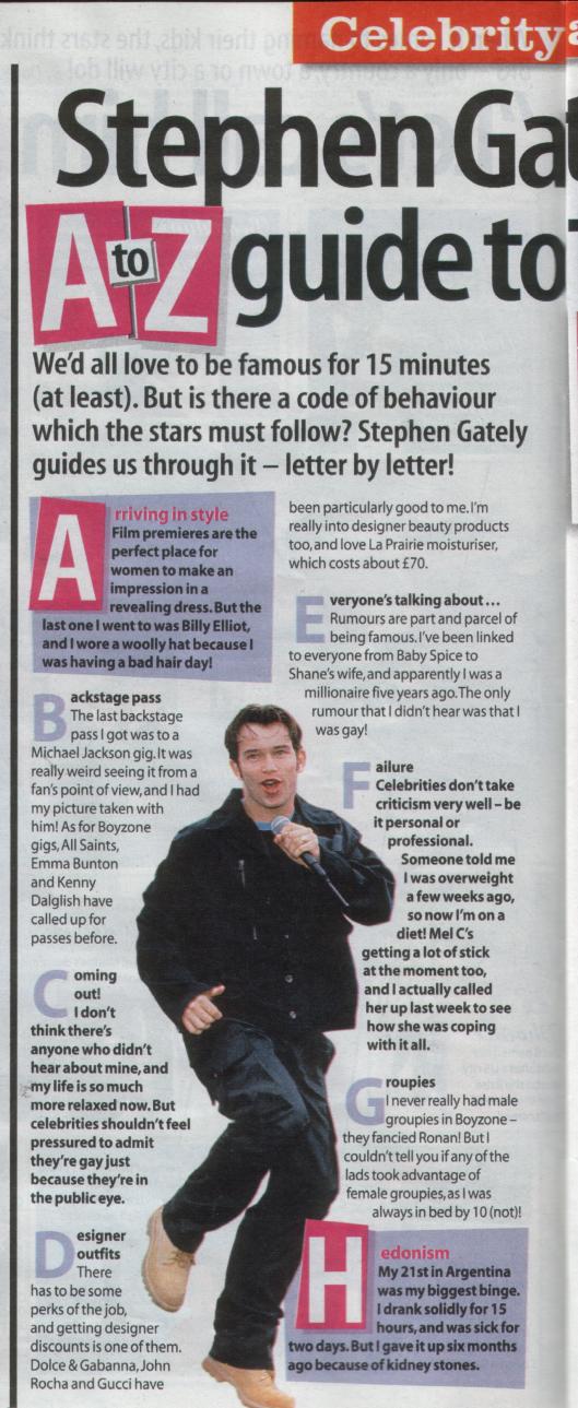 The last backstage pass I got was to a Michael Jackson gig. It was really weird seeing it from a fan's point of view, and I had my picture taken with him! As for Boyzone gigs, All Saints, Emma Bunton and Kenny Dalglish have called up for passes before.