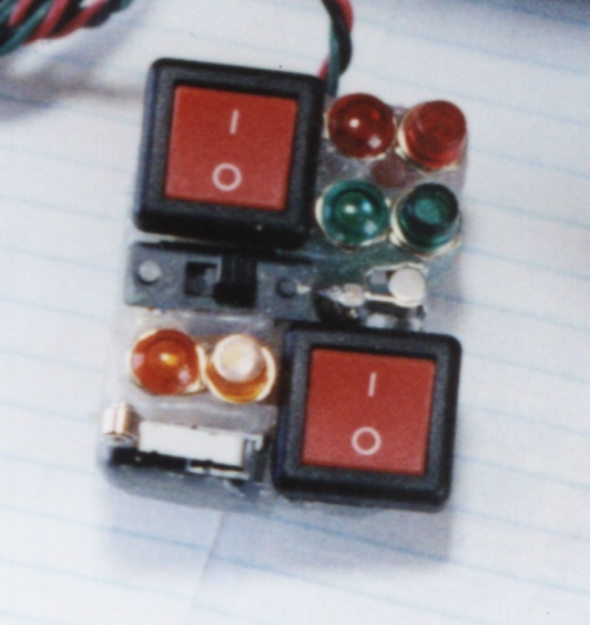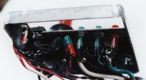 The photo on the right side was intended to show the wiring of the switch and the outlet. All that can be seen is the epoxy strain relief on the back side of the PowerMouse jack. It is added after the wiring to the jack is in place. The red & green object in the center is merely a wire junction made with red and green electrical tape. Behind it is the dummy neon light used for 220 volt applications.