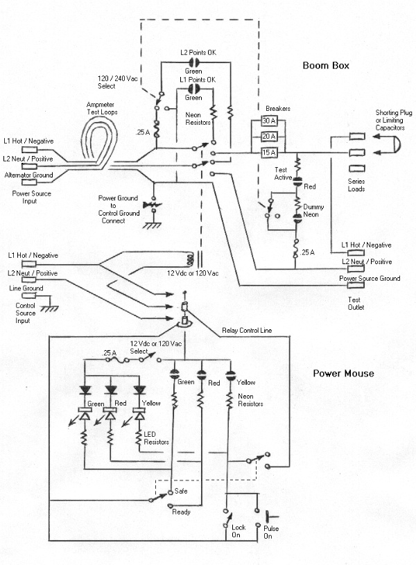 The upper row of photos are of the PowerMouse. It is the hand held control panel for the BoomBox. The photo of the back side shows how it looks before testing. After testing it will have several insulating layers of Goop adhesive as its casing. At this point it is a collection of switches and lights held together by hot melt glue. The photo on the right side shows the clearance of the mini stereo jack that it plugs into. The jack has nuts epoxied to it for mounting. Note the 1/18" gap around the jack. This is to isolate the PowerMouse circuit from the metal box. For some applications the metal box will not be neutral or ground.
