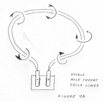 It is difficult to view electricity and magnetism as being the same thing. Obviously they are closely related but is it the same EMF that moves electrons ? Yes. To see how it comes into existence from electrical origins another thought experiment is needed. Get the ideal battery used in the last experiment and connect a large loop of perfect wire ( pipe ) across its terminals. See figure 4. The wire is perfect because it has no resistance. The wire used in the hole theory explanation was allowed to have an extra space filled by the negative terminal and to have an empty space created by the positive terminal. That extra space and empty space will now be taken away. In their place is a magnetic field that rises around the wire. The field is uniform density from the negative terminal to the positive one. Its shape is that of rings around the wire.