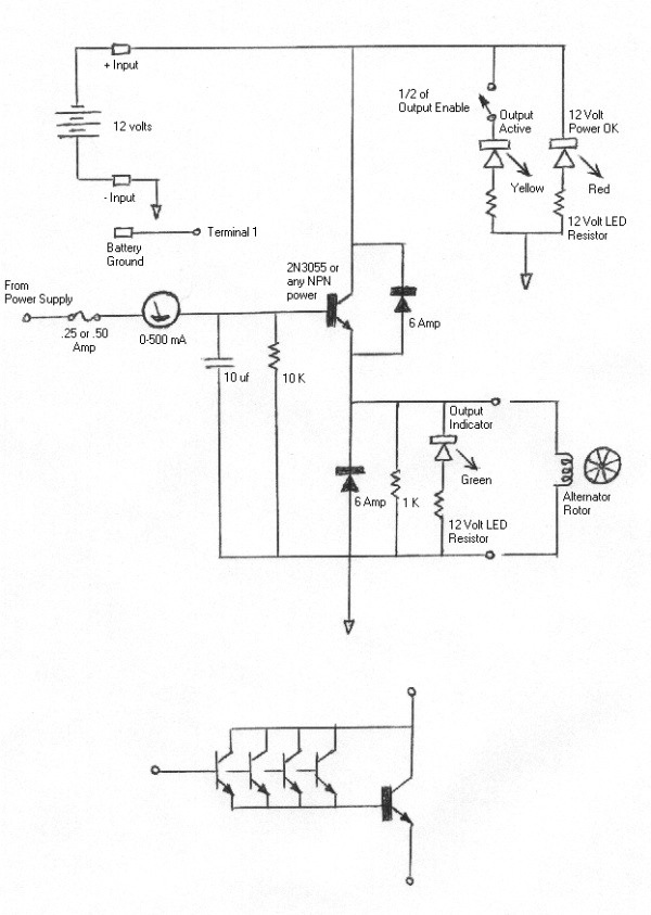 The circuit itself is a simple voltage follower power transistor using a small power supply as its reference voltage. The power that comes out of it is provided by an external car battery. The car battery provides a low impedance source. That means that it will be able to power the alternators rotor and not get weak under heavy loads. The basic design of the circuit is primitive. That is chosen for durability. The experiments that it is intended for will probably have short circuits, overloads, arcing and other unintended problems. A more fragile power supply would burn out every time. At the very least it is hoped that this one may be repairable after accidents happen.