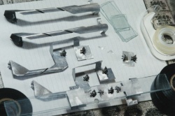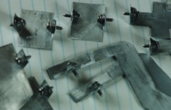 Begin by folding spark gap bases 90 degrees. Produce the holes for the pop rivets. Set