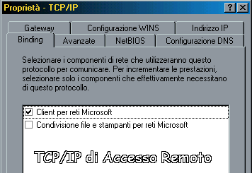 Se non compare già NetBEUI, aggiungiamolo: Aggiungi->Protocollo->Microsoft->NetBEUI. Se avete il "Dispositivo di Accesso remoto" installato, Windows vi installerà generosamente due copie di NetBEUI; una per la scheda di rete e l'altra per l'accesso ad Internet. Visto che Internet gira su TCP/IP possiamo eliminare il componente "NetBEUI -> Dispositivo di Accesso remoto".