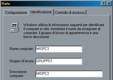 Passiamo alla scheda "Identificazione", dove dovremo inserire i dati del nostro computer e della nostra rete. NB: il gruppo di lavoro deve essere uguale per tutte le stazioni collegate.