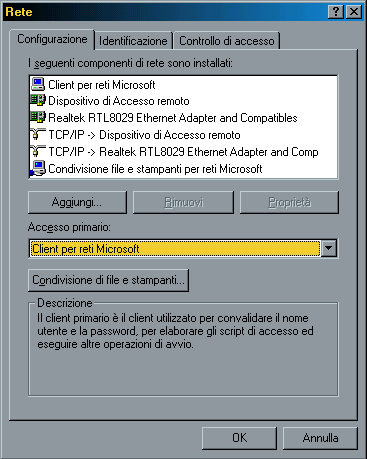 Nella casella "Accesso primario" selezionamo "Client per reti Microsoft", come nella prima figura di questa pagina.