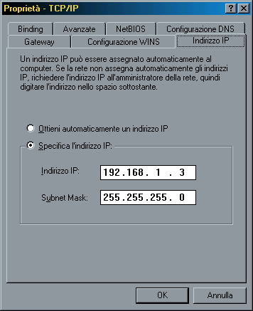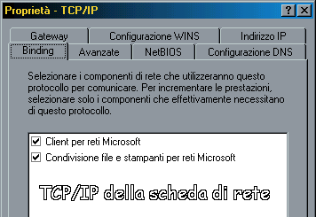 Diversamente dal NetBEUI, che non ha bisogno di ulteriori settaggi, TCP/IP deve essere configurato. Selezioniamo quindi il TCP/IP della scheda di rete e facciamo click sul tasto Proprietà. Si aprirà la finestra Proprietà di TCP/IP. Il Binding l'abbiamo visto nel paragrafo precedente.