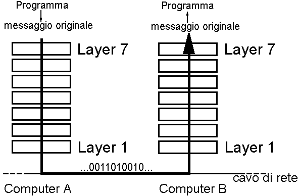 Come si vede nella figura qui sopra, l'applicazione del computer A genera il messaggio. Poi questo scende nel primo layer, il 7, poi nel 6 nel 5 e così via fino a che non arriva al layer 1.
