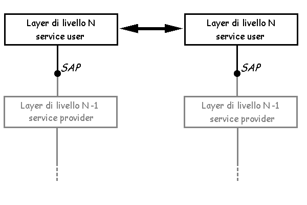 Un layer di livello N viene chiamato service user, uno di livello N-1 è detto service provider. I servizi di N-1 sono forniti ad N in un punto detto SAP, service access point, che è semplicemente il luogo in cui N può chiedere i servizi di N-1.