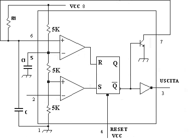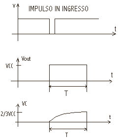 Il monostabile ha un solo stato stabile, nel nostro caso l'uscita si mantiene sempre a livello basso finché non arriva un impulso dall'esterno, sul piedino 2 (trigger). Infatti mantenendo a livello alto il piedino 2, il comparatore inferiore dà in uscita un valore basso; quindi S=0; invece il comparatore superiore, supponendo il condensatore inizialmente scarico, dà in uscita 0; quindi R=0; quindi il latch S-R resta nella condizione di azzeramento, cioè Q=0; /Q =1; l'uscita del timer è zero; il transistor va in saturazione, essendo la base polarizzata direttamente, il piedino 7 si trova a massa, ed il condensatore C non si può caricare attraverso R. Il circuito si mantiene stabile con uscita a livello basso. Quando arriva un impulso negativo al trigger, la tensione sul piedino 2 si porta a zero, il comparatore inferiore dà in uscita un livello alto; S=1; mentre R=0; immediatamente l'uscita Q del latch S-R si porta a 1, mentre /Q=0; l'uscita è quindi 1; il transistor è interdetto, il condensatore inizia a caricarsi attraverso il resistore R1; quando la tensione sul condensatore raggiunge i 2/3Vcc il comparatore superiore commuta portando l'uscita a livello alto, quindi R = 1; mentre il comparatore inferiore ha già la sua uscita a livello basso non appena il condensatore ha superato 1/3Vcc; quindi S = 0; l'uscita del latch si azzera, quindi Q =0 e /Q= 1; l'uscita del timer si porta a livello basso; il transistor va in saturazione scaricando il condensatore. Il condensatore C1 serve come livellamento della tensione di riferimento. Il morsetto di RESET va collegato a + Vcc, in modo da escluderlo.