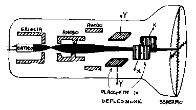 Prima di passare ad una sua descrizione cerchiamo di comprendere come sia resa possibile la visualizzazione di un segnale sullo schermo. Il "cuore", per così dire, di un oscilloscopio è costituito da un tubo a raggi catodici (CRT), rappresentato in fig. 2, come si può osservare esso è composto da un catodo, da un sistema di griglie e di anodi, da un sistema di placchette di deflessione e da uno schermo.