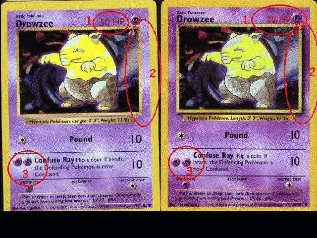 ~Check out the colors. This is a little harder to notice. Basically, the colors on the real cards are are about the same brightness. In the fake ones, i noticed that the backround (purple area on the drowzee card) is dull and the pokemon picture is bright. This isnt very effective, though. It's just a little thing i noticed.