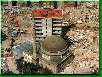 Sebuah masjid yang berdiri teguh dan megah walaupun semua bangunan runtuh menyembah bumi di dalam kejadian gempa bumi di Turki |