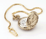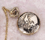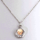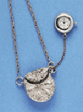 wings to reveal a watch! 27-1/2" chain. Simulated mother-of-pearl face.