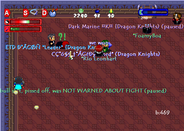 Well the second battle we arranged with dragon Knights, went much smoother, mainly, because me and Rio were actually there, and that made the biggest difference, but before the battle results a few prerequisites to the fight...first I challenged ETD, because I was eager to have a real, guild battle, he said yes of course, but he was on the phone with his mother so we waited, the battle was definately on, while we waited he messaged my real life bro Rio, who was in the fight, to "take off our tags", and Rio (Justin) Replied, "Why the hell do we have to take our tags off?" He got ONE warning from Eric saying not to 'cuss' (NOTE: the reason we had to have tags off is that DK's tags werent online so they could hit each other in battle, so we complied after all it was only fair. ) Well next thing Rio knew, he got a warning from Sadie, saying not to cuss, then he was warped to jail, after ONE warning...and it was a very mild expletive at that, I myself have heard ETD say and describe worse things...Erics real motives in getting my brother Rio jailed, was he tried finding an excuse to jail him, so he wouldnt be able to fight in the spar, Eric knew that Rio had a high rating and is one of the better sparrers in graal...well to Erics surprise Rio had another unjailed account...which he used in the battle...Sorry if you got fumed eric, but hey man, thats tough rocks eh? Well the next one is a real laugh and I'm sure all of you reading this will think of it as funny, but when the Dk's came to spar us, we had already dropped (whoever had them) gold names by killing each other...when DK came nearly all of them had gold names, and we asked them to "lose the gold names", Eric himself replied..."You didn't mention that in the rules." He just amuses me with his stupidity and the way he takes guild things so seriously, I made SeeD so friends and Final Fantasy Fans could have fun together, but hackers, and other problems sure did ruin that for us, so we have to fight now...but oh well, anyways,... we won the second battle, after a looong lag filled spar with Eric, I beat him, then this one guy lagged out completely, but he came back and me and Rio finished him, I am not possesed by one bit of doubt that the first battle would have been the same if it would have been all SeeD's in that one as well, as it was in this one... anyways we won, and ETD stormed off, not taking any pictures this time, not only are you a jerk man, your a sore loser too...