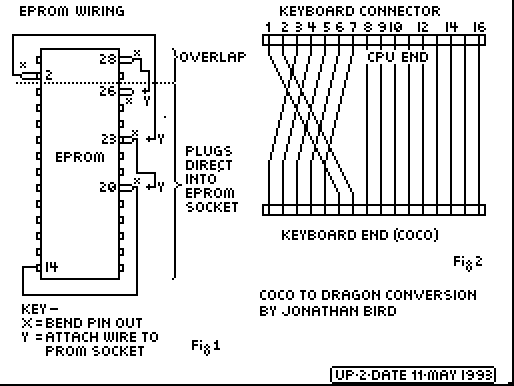 Replacing the ROM Chips: The first thing to note is you cannot simply swop the ROM chips from either machine. In order to work properly, the ROM needs patching first. From now on I'm assuming the conversion is from CoCo to Dragon since in addition to the problems awaiting, there is also the fact that the Dragon PROMS are soldered on the main board, not socketed. Hence, the Dragon's ROM will need to be copied to main RAM, the patches made, it saved to disk and then blown onto EPROM. It can be done for simplicity's sake as follows: