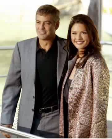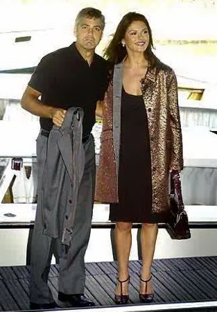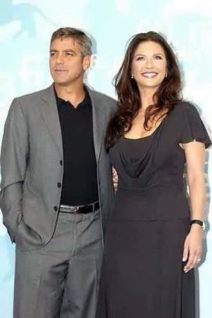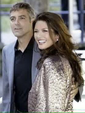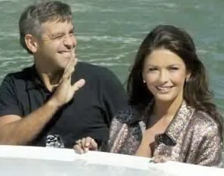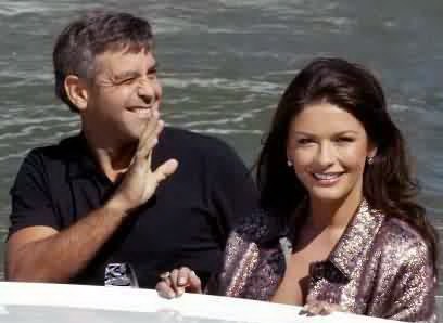 Girls screamed and paparazzi jostled for position as the stars pulled up in an elegant wooden boat to promote the new film about a Beverly Hills battle of the sexes. Zeta-Jones dazzled in a fluttery, ultra-feminine black dress, but Clooney was the main attraction.