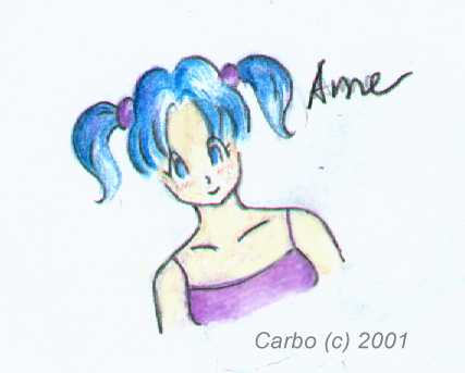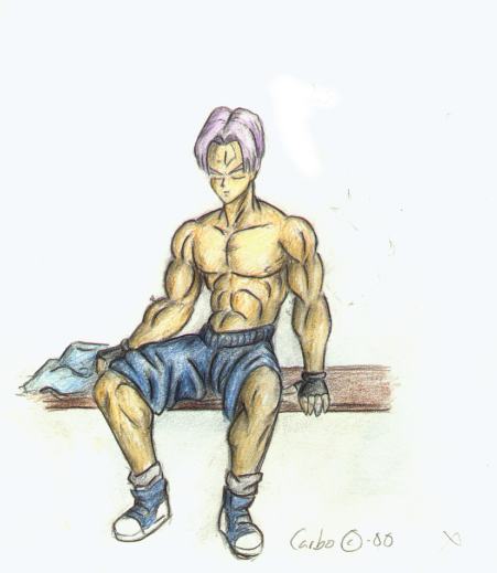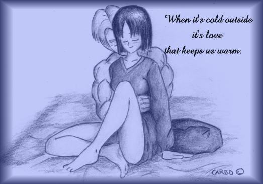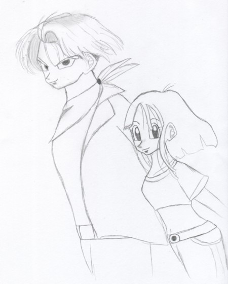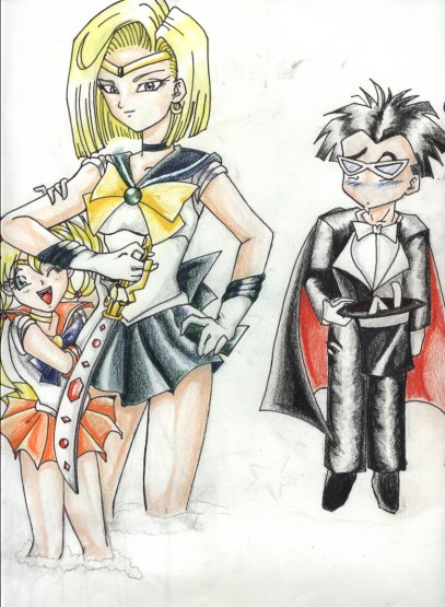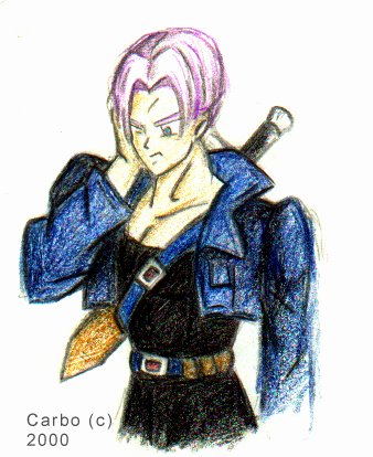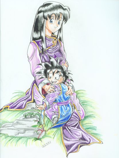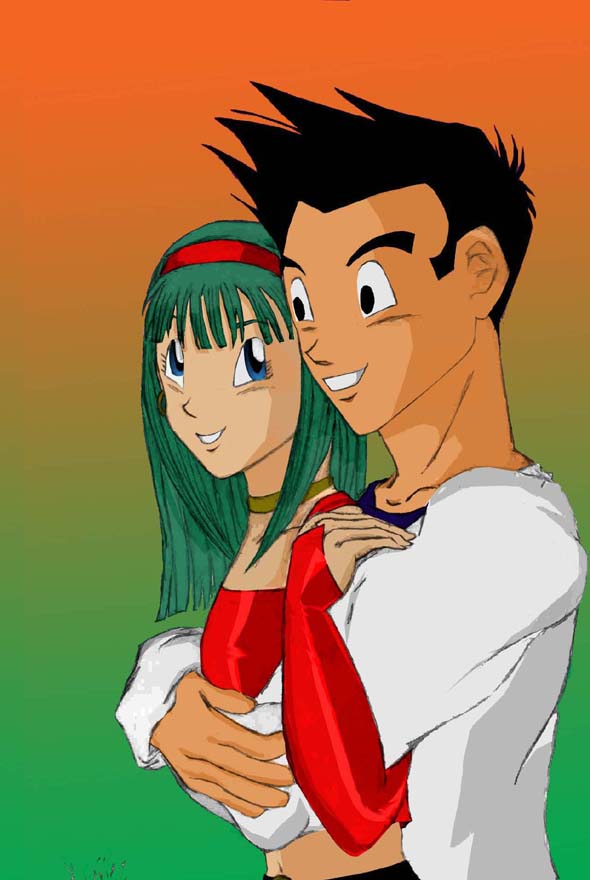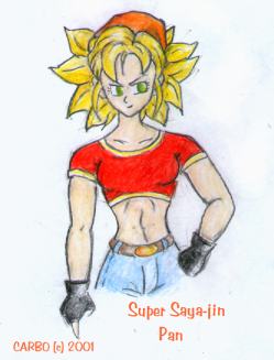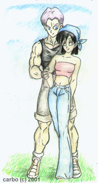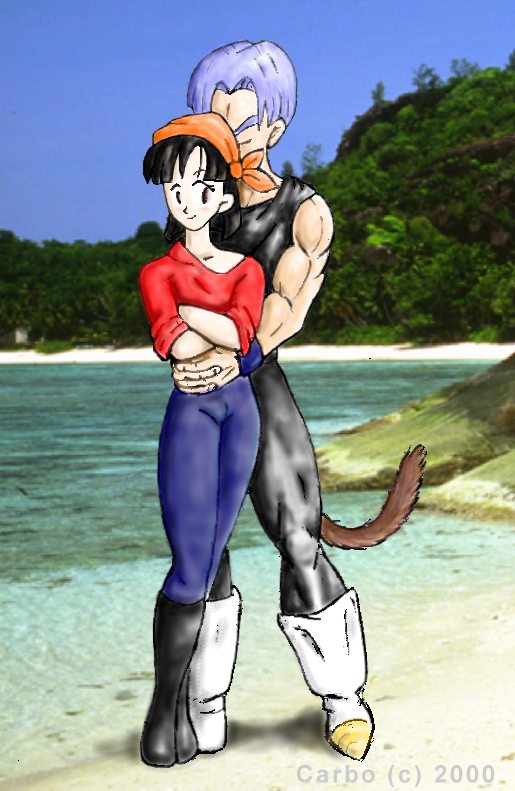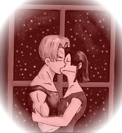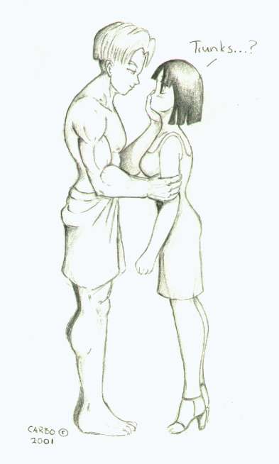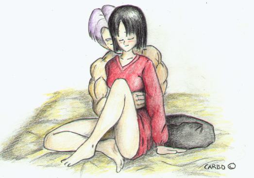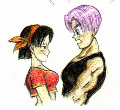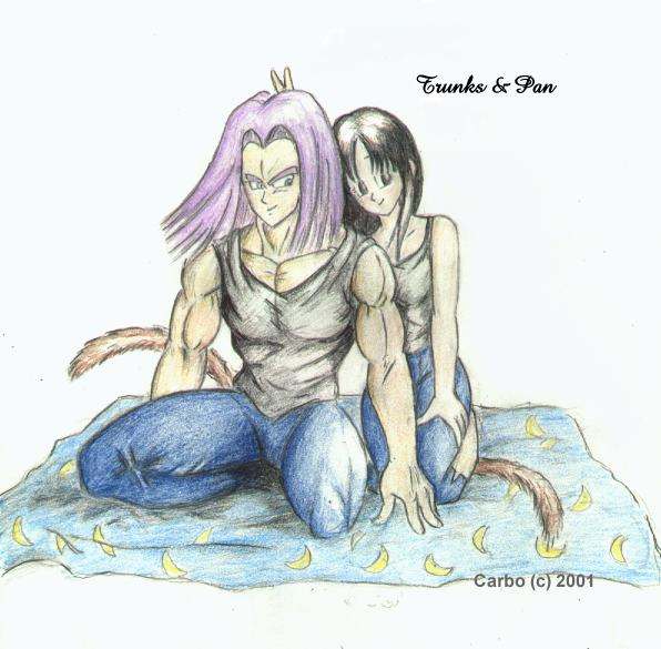 Pan & Trunks art Updated October 14.(Guest art, regular art, go down) My stuff Bed Trunks and Pan laying in bed in the morning light. PG for bare skin.Hand drawn. Yuki The custest hottest picture of teengae Yuki, (T/P son from One of These Days) Hand drawn/colored. Ame The custest picture of a teen Ame, my vision ofd Trunks/Pan daughter. Hand drawn/colored. Trunks & Pan This is a sweet pic, T & P gazing into each others eyes. Hand drawn. SSJ Pan Here we go, a subject I just had to do. SSJ Pan! Chibi Lei My view of Trunks' and Pans daughter from "Automatic Flowers" written by Rayne. Lei An older Lei, I'd say about 15. Lei & Goket Both kids in Super Saya-jin mode. Turned out real good. Love the hair and clothes. Hand drawn & colored. Twosome Trunks and Pan sitting together on a moon blanket (the one form the fanfic) Hnad drawn and colored Cute Couple Trunks and Pan in some cool clothing, well Pan's dressed in pastel hippi-clothes. Cute. Hand drawn & colored. HuggingAh this is sweet! Trunks hugging Pan from behind while their sitting on a bed. Has actually something to do with a fic I'm wrtiting. Hand colored. Hugging Same as before, only this one's blue and comp. altered. Nice, Like 'em both. Chirsitmas Kiss Trunks and Pan kissing by a window. Aah this is so sweet, and pretty.(also as a card) Comp. altered. Drippin Wet The sexiest pic of Trunks dressed only in a small towl. God I love this one! Comp.colored ' Trunks relaxing after a hard workout. Mmm..lot of bare skin=) Hand drawn/colored Holiday hug A cool pic of Trunks and Pan on some tropical island. comp. colored and altered. Surprise I don't know what Pan has told him, but looks shocking. A hand colored drawing. Devine Beauty A beautiful computer colored picture of Pan drawn in Sailor Moon style, floating in the sky. Smile A close up of Trunks smiling. Hand colored. Trunks rubbing his cheek. Maybe Pan slapped him? Naah, she wouldn't do that, she'd hit him.=) Hand colored. Pan in a fighting stance a hand colored drawing of Pan in a fighting stance. Notice the Capsule Corp. shirt =) Pan from the side a side close up of a dreamy looking Pan. Looks like she'd leaning into kiss someone. One of my faves =) Hand drawn. Pan thinking of Trunks I imagine. Cute =) Hand colored drawing. Guest Art - By Bria A cute black & white Pan-chan Trunks and Pan (black/white) Rose Pan A cute image of a long haired Pan holding a Rose -By m samma The cutest pic of Pan in Trunks clothes. Aww....Pan and Trunks hug. Doesn't Truks look gorgues *wink* Gohan finds out about Trunks and Pan. And a cute picture of Bra & Goten -Sondra Blockman A cool sketch of Bulma and 18 in ...strange but cool outfits. Sailor Moon! 18, Krillin and Marron in Sailor outfits. =) Beautiful 18 posing in a black dress. Uuuh! Cute! It's Chichi and little Goten. -Jessica Borick Cute! Pan & Trunks in their swimsuits. Trunks and Pan share a kiss.