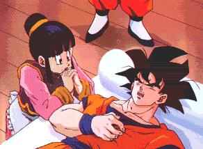Goku and Chichi, Bulma (in the middle) and Goku and Chichi again, this time adults.