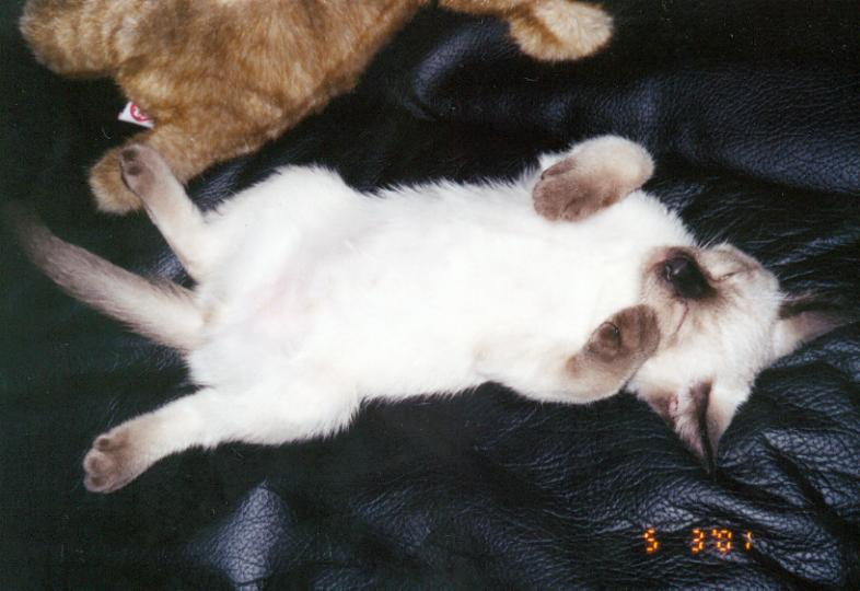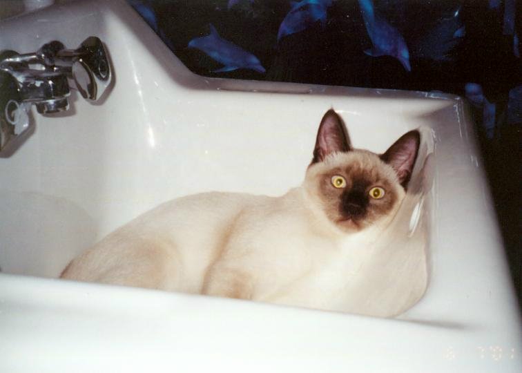 | Siamese cats - popular short-haired breed of domestic cat originally from Siam (Thailand). Its origin as a breed is unknown. The Siamese is a lithe, long-bodied cat with slim legs and a long, slim tail. It has a long, wedge-shaped head and slightly slanted blue eyes that give it an "Oriental" expression. |