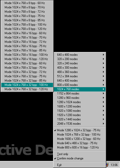 KvikRes KvikRes is a simple Win32 application, used to quickly change between display modes. It places an icon into the System Tray. By clicking this icon, a pop-up menu with available resolutions appears above the System Tray. This menu contains a submenu for each display resolution, the installed video card is capable to display. After the user opens one of these submenus, it displays all available color depths combined with all available refresh rates for the selected resolution. After selecting one of these modes, the display mode changes immediately. If confirmation is selected, the user needs to confirm the new mode within 15 seconds. If he won't do so or if the monitor does not support the new mode and does not display anything, the original display mode will be restored after the interval elapses. At the bottom of the main menu, there are recently changed modes, providing the fastest way to change between frequently used display modes. This application (unlike official QuickRes application) works under both Win95/98 and WinNT4/2000.