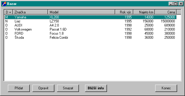 Bazar Bazar is a training example written in Borland Delphi. It is designed to manage auto-marts. The main window contains a list of motor vehicles and buttons for adding, editing, deleting and displaying additional information about selected vehicle. These function are also available via right mouse button menu. In the Add Vehicle dialog box, the user may enter information about a vehicle. Most of entered fields are shared by all basic types of vehicles (cars, motorbikes and trucks). Only a few change with the vehicle type. For example for cars it is possible to enter a color of the vehicle, while for trucks the user can enter the weight of the vehicle.