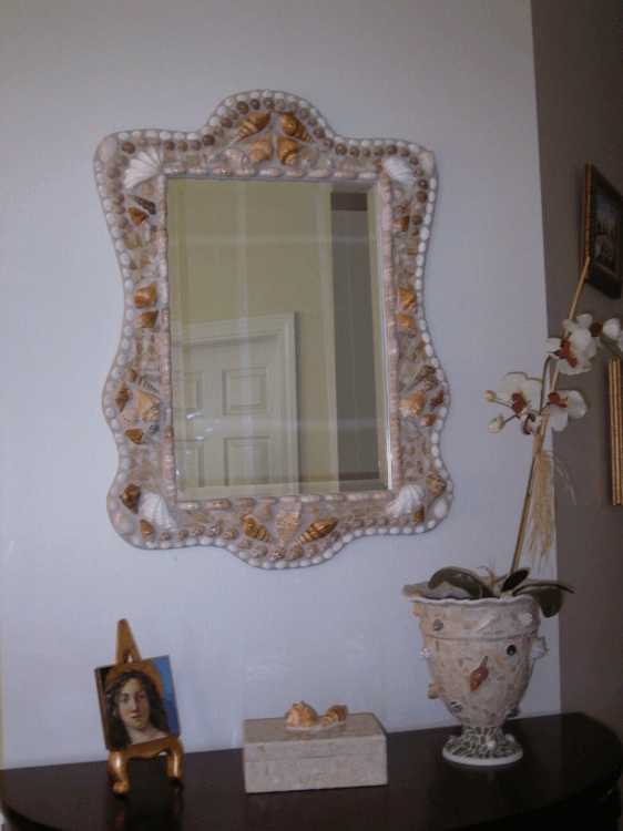 A mosaic of seashells and glass finished withterra cotta grout.