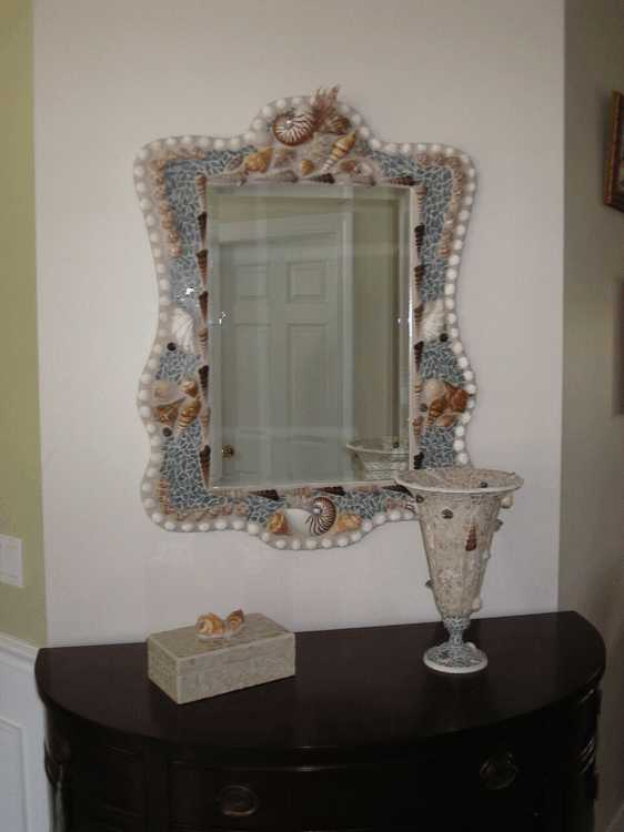 A mosaic of seashells and blue-green stained glass.