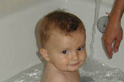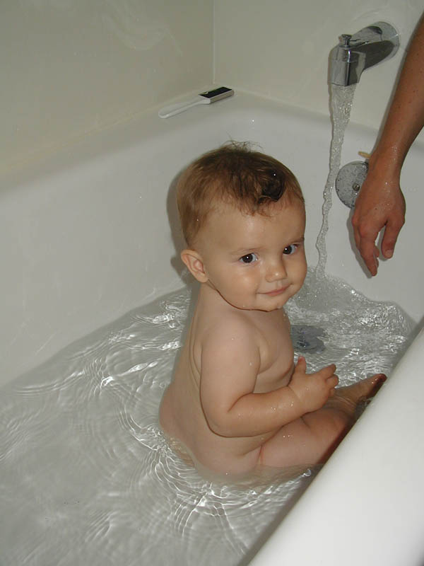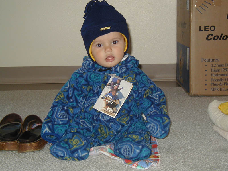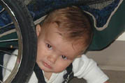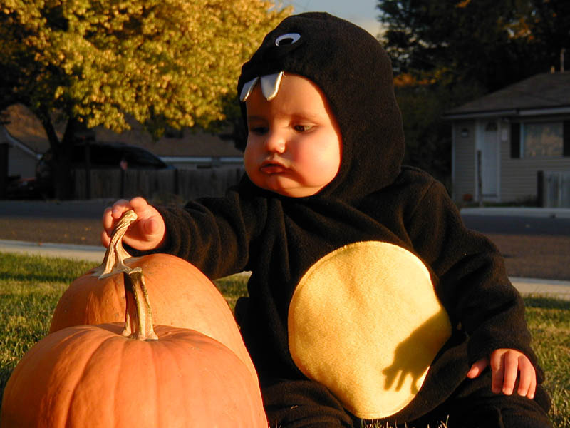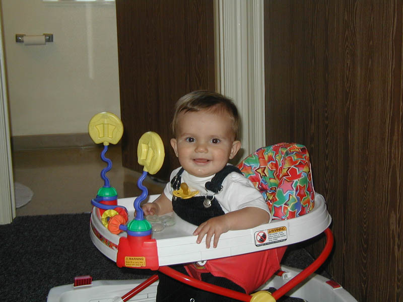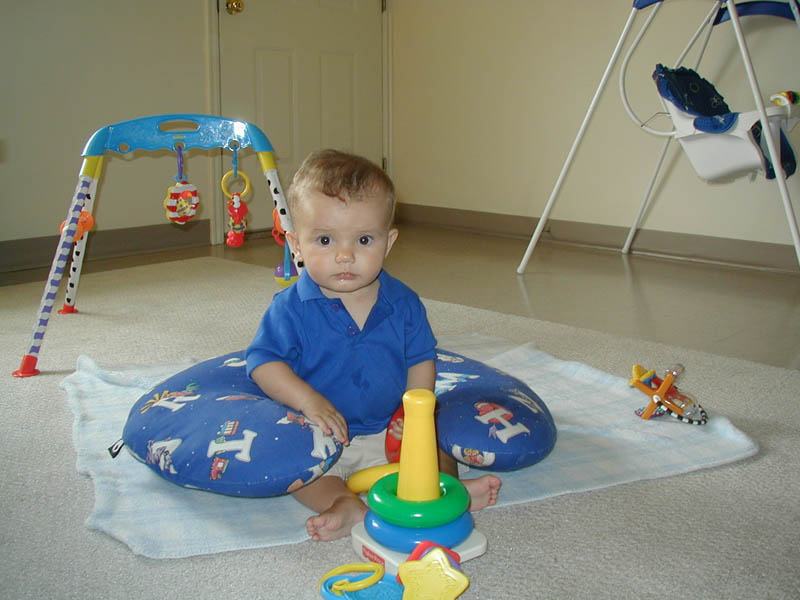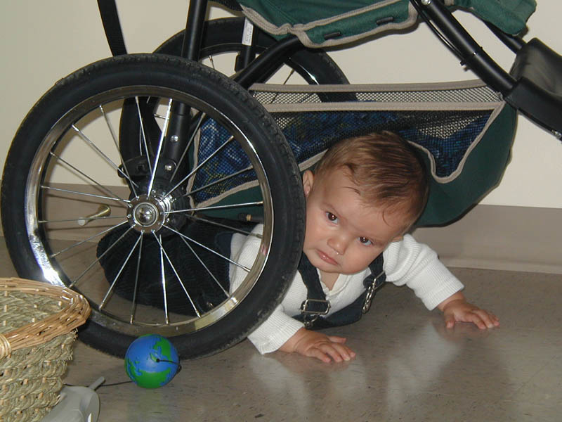 well, well, well! the little boy andrew has almost become a toddler since our last update! he now is nine and a half months and believe me, it is so fun to see him grow! andrew has demonstrated a very high capacity of being seated on his own. he never falls on his back nor on his side while being seated (until today, where he went from his seated position to his belly). he does not crawl yet, but scoots/rolls practically wherever he wants to. he was 20 pounds and four ounces when we got him checked out this last week. he is a little chubby, to say the least. his fine motor skills continue to impress us. he is so good at picking up litlle objects with his thumb and his index, bringing those objects close to his eyes and then scrupulously observing them with his studious eyes. andrew is still on his rigourous schedule... i say rigourous because it used to be rigourous for him, but now it is for us... he will not budge from waking up at 6h30am and going to bed so tired at 7h30pm. he says "daddy" (he repeats after us) most of the time we trigger him. he also can say "doggy", probably after seeing roxy so many times, and probably wondering how such a little thing can go places without batteries. andrew has developed a love for little children. everytime he sees a little person, he gets very excited and wants to go play with them. in the last months, tara's friend, holly, and her husband jeff and their son mason, have moved and have become our neighbors. mason is a month younger than andrew, and believe it, they play a lot together and love each other. when andrew sees mason, he squeals with joy. i already have commented on andrew's mobility. he does not crawl yet, but goes places! actually, he rolls! even though he has just recently learned to be on his hands and knees (which is a sign that he might crawl before walking...since he is late at crawling, we thought that perhaps he would skip the crawling...some babies do). he likes the non-fashionable manner of rolling. for the halloween season, he has been fashinated with our pumpkins. whenever we walk out the door, he want to touch those that are close. he love being held upside down, or at least when seated on us, he likes to have his head between our legs, upside down. even though he is very good at sitting, it is sometimes difficult to sit him, because his new thing is to stand up. when he is seated, we give him our two indexes (fingers) and he pulls himself completely up, without help! then he loves to look around and talk blabla while imitating real people who stand up. he also has discovered his tongue. he twists it any way possible and make the funnest sounds. his bath is probably still the best and most enjoyable moment of his days. and guess what: andrew had never fallen asleep on another human being (he did when a newborn, but lost the habit during his crib training.) until yesterday, when he showed much fatigue at a halloween party, and gave it up, on his mother's chest. andrew is the best sleeper. he has not yet awaken during the night since he learned to sleep through the night in his seventh week.