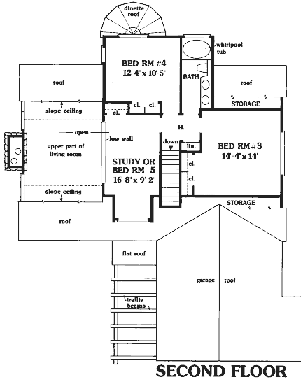 used as a den, open to the living room below. Here too is another large bath with two sinks and an oval whirlpool tub.
