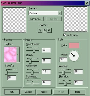 I used sculpture on this angel tag, with these settings, using the color I saved from my text.