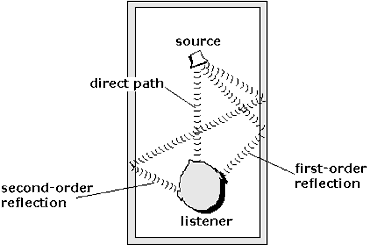 De verhouding van de geluidsintensiteit van beide oren is dus gelijk aan de verhouding van de kwadraten van de afstanden van beide oren tot de geluidsbron. Een tweede belangrijke factor is de ITD, oftewel het tijdsverschil tussen de aankomst van het geluid bij beide oren. Ook hier zal een afbeelding e.e.a. weer een stuk duidelijker maken: ![]() Aangezien geluid een eindige snelheid heeft (in lucht ca. 343 m/s) zal een geluidssignaal vrijwel nooit tegelijkertijd bij beide oren aankomen. D.m.v. dit tijdsverschil kunnen de hersenen o.a. de juiste hoek van de geluidsbron bepalen. Indien de geluidsbron namelijk precies van links of van rechts komt is de ITD maximaal. Als de geluidsbron precies voor de luisteraar staat is de ITD gelijk aan 0. De waardes die hier tussen liggen zijn een maat voor de hoek van de geluidsbron. Als we de breedte van ons hoofd schatten op 15 cm zal de ITD maximaal 4,3*10-4 seconden bedragen. De oorschelp Een ander systeem dat de hersenen hanteren bij het lokaliseren van het geluid is de oorschelp. Deze oorschelp kan namelijk worden opgevat als een variabel filter dat midden tonen versterkt en hoge tonen verzwakt afhankelijk van de hoek waarmee ze binnen vallen. Onderstaande afbeelding laat bijvoorbeeld het verschil in geluidsspectrum zien tussen het geluidssignaal van de geluidsbron en het geluidssignaal nadat het door de oorschel is opgevangen. ![]() Door deze spectraveranderingen van beide oorschelpen te vergelijken kunnen de hersenen zeer nauwkeurig een driedimensionale hoek van de afkomst van het geluidssignaal berekenen. Hoe dit precies gebeurt is helaas nog steeds onbekend. Ook zijn er nog vrijwel geen wiskundige modellen van de oorschelp, zodat we van deze methode geen wiskundige afleiding kunnen geven. Aangezien de oorschelp relatief klein is, kunnen alleen frequenties met een golflengte van enkele centimeters of kleiner worden gefilterd door de oorschelp. Een geluidssignaal van 686 Hz heeft een golflengte van 343/686 = 0,5 meter. Een dergelijk laag geluid zal zowel door de oorschelpmethode, als door de IID/ITD methode moeilijk te lokaliseren zijn. Een geluidssignaal van 6860 Hz met een golflengte van 343/6860 = 0,05 meter (= 5 centimeter) zal daarentegen met beide methode goed te lokaliseren zijn. Dat dit klopt kun je zelf makkelijk uitproberen. Als je de stereotoren aanzet en je ogen sluit, zijn de tweaters (hoge tonen speakers) makkelijk te lokaliseren, maar het lage geluid lijkt overal vandaan te komen. Verdere geluidseffecten (geluids absorptie, reflecties) Verder zijn er ook nog enkele andere methoden om de locatie van 3D geluid te bepalen. Zo wordt een zacht gedempt geluid van zeer ver weg geïnterpreteerd en een zeer gedempt geluid vanuit een andere ruimte, gescheiden door muren. Onderstaande afbeelding toont deze absorptiecoëfficiënt. ![]() Ook zijn reflecties zeer belangrijk: als geluid weerkaatst wordt door muren komen bij onze oren meerdere varianten van hetzelfde geluidssignaal aan. Met moeilijke berekeningen kunnen onze hersenen dan extra nauwkeurig de locatie van de geluidsbron bepalen en ook tevens veel informatie vergaren over de omgeving. Mensen met goed getrainde oren (bijvoorbeeld blinden) kunnen door geluid precies bepalen waar een muur staat e.d. Onderstaande afbeelding toont enkele reflecties van een geluidsbron naar de luisteraar toe: ![]() Als laatste spelen psychologische methoden ook mee. Als we het geluid van een helikopter horen zullen onze hersenen meteen interpreteren dat dit geluid van boven komt. Het geluid van een blaffende hond daarentegen wordt meteen vanaf beneden geïnterpreteerd.
