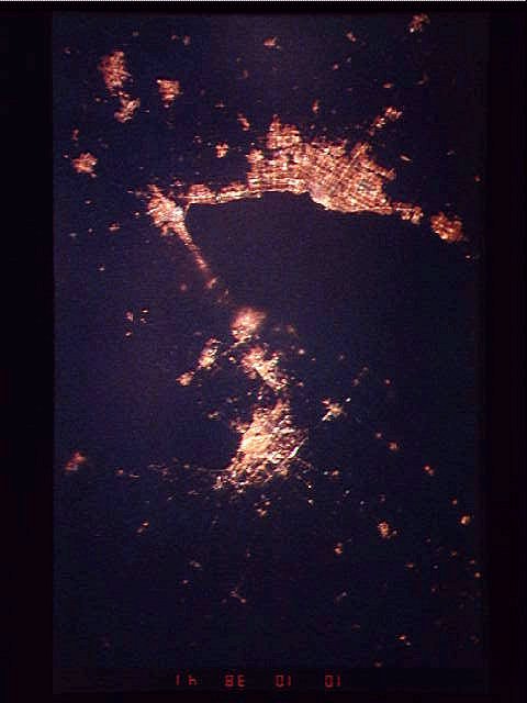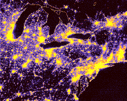 Thermal image of north east North America from the DMSP satellite. Yellow areas underscore vicinitites with highest light concentrations.