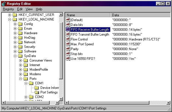 The second option involves editing the registry settings. Go to HKEY_LOCAL_MACHINE | SysData | Ports | COM1 | Port Settings. See what the FIFO Receive Buffer Length string value is. It should be 00000000::14 bytes. If not than change the number of the bit to 14, that's the maximum that the setting will go. Now look at the FIFO Transmit Buffer Length, make sure that the value is 00000000::16 bytes. It can't go any higher so don't put it higher. If you want you can mimic the settings that I have below and plug them into your registry files, but be careful. These settings may not work with every computer so do this it at your own risk.