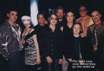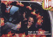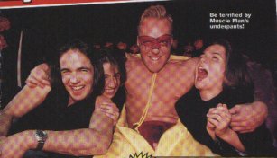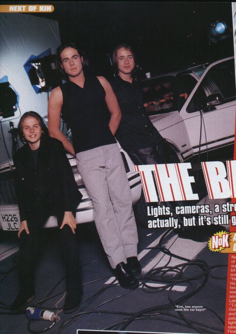 superherp for the past three hours.It's a bit of a squess, and Mark's not too sure about their new muscle-man friend. " he's covered in oil!" he squeals Still, his face lights up when it's the turn of two saucy grils to climb on to the backseat with them." He's been talking about sex to everyone today," Moans Nathan. Later they confess they chose this script" Cos it had the most girls in it!" Outside the limo, various gaffers,grips and technicians manhandle white poylstyrene boards into position, and lights are raised and dimmed and raised again'til the director's happy. Finally, there's a shout of " Positions now, please"- which is the cue for Mark to jump out of the car and run to the loo! All in all, the limo scenes take a bum-numbing ten hours to film. |