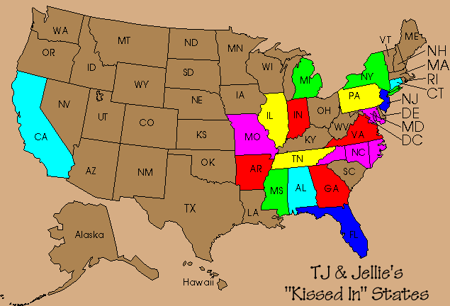 TJ and Jellie are keeping up with all the states they've "kissed in" since they have been together. They've kissed in Canada too... but we're waiting to start another map for out-of-the-country "kissed in" places.