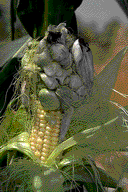 Control Measures: This is a relatively difficult disease to control, but fortunately is rarely a problem in agriculture today. When it is a problem, it is usually in crops like sweet corn, where the corn itself is the finished product, and even a small amount of smut can decrease the value of the crop. Most corn sold on the market at this time has some amount of resistance to Ustilago maydis, but even the most resistant plants are susceptible during early pollination, when the growing silks of the corn are easy targets to the fungus. If the pollination is delayed, there is usually greater susceptibility and chance for disease. Because the spores are airborne and can survive long periods in the soil, crop rotation and deep plowing are only partially effective. References: