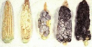 Common Name: Corn Smut Causal Agent: Ustilago maydis. This fungus is in the phylum Basidiomycota. Host Range: This species of fungus is specific to corn (Zea mays). Geographical Range: Corn smut occurs anywhere that corn is grown. Ustilago maydis is most prolific in warm, dry climates. Symptoms: Ustilago maydis infects plants from seedling stage to maturity. The smut it causes is most commonly found on the sexual parts of the corn plant, namely the ear and the tassel, but it is also found on the leaves and stems. When it infects these parts, a greenish to gray gall forms. This gall enlarges as the fungus matures, and the gall becomes full of brown to black teliospores. The galls can be minute to very large, usually one to fifteen centimeters in diameter. Dissemination: Ustilago maydis disseminates by spreading the teliospores it creates inside the gall. The galls on the sexual parts tend to rupture and spread the teliospores through the air. On the stems and leaves, however, they tend not to rupture, and stay in the plant debris. They can survive in the plant debris for many years. The teliospores then germinate and form a basidium, and from each basidium come four basidiospores. The basidiospores can be spread in the air or by water to plants. They then germinate and infect the plant. Disease Cycle: When the basidiospores germinate and infect the corn plant, the fungus usually stays localized at the point of infection. In a few cases, it can spread systemically, but this is usually in very young plants. It takes two basidiospores to cause an infection, because the basidiospores are haploid and only diploid mycelium can continue to grow and reproduce. Ustilago maydis is most likely to infect sexual parts of the plant under high stress conditions, and when pollination is delayed. When the spores unite and start growth, they cause neighboring plant cells to swell and divide, and form galls. The mycelium of the fungus infects these enlarged cells, and uses their contents for food. When the fungus matures, it forms teliospores, which are released into the environment. The teliospores cause new infections, usually during the next growing season.