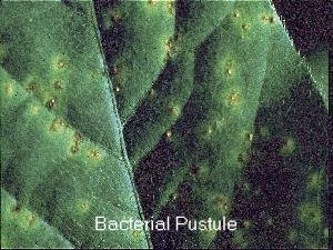 Symptoms Soon after infection has taken place, small, light green spots appear on the leaves. These spots become raised in the center; and can appear on both the upper and lower surfaces of the leaf. Raising of these lesions occurs due to rapid growth and multiplication of the cells within the lesion, called hypertrophy and hyperplaisia, respectively. The pustules grow outward and produce necrotic tissue in the center, with a chlorotic halo surrounding the necrotic tissue. Dissemination The causal bacteria can overwinter in the soybean seeds themselves or in infected debris. Splashing water and wind can spread the inoculum from the debris onto the soybean plant to facilitate infection. Warm, wet weather aid in the infection process. Disease Cycle After the bacterium is placed in contact with the plant, it invades the tissue through natural openings, such as stomata, and through wounds. It multiplies intercellularly and is mobile in the intercellular space until it infects a cell. It then digests part of the cell wall, and binds to the cell. Infected cells experience an increase in cytoplasm, decrease in size and change of shape of chloroplasts, and enlargement of nuclei. These cells collapse and die, and after enough cells have died, tissue dies as well. This dead tissue can harbor the bacteria and facilitate its overwintering. Control The best form of control is use of resistant, disease-free seed stock. Crop rotation and burial of inoculum by deep plowing have also been effective in controlling this disease. References