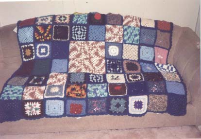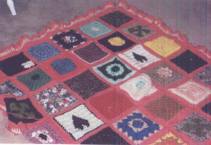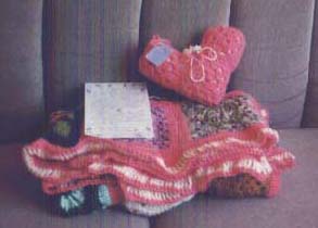 'angel' volunteer, crocheting squares & assembling comfortghans for "The Angels of