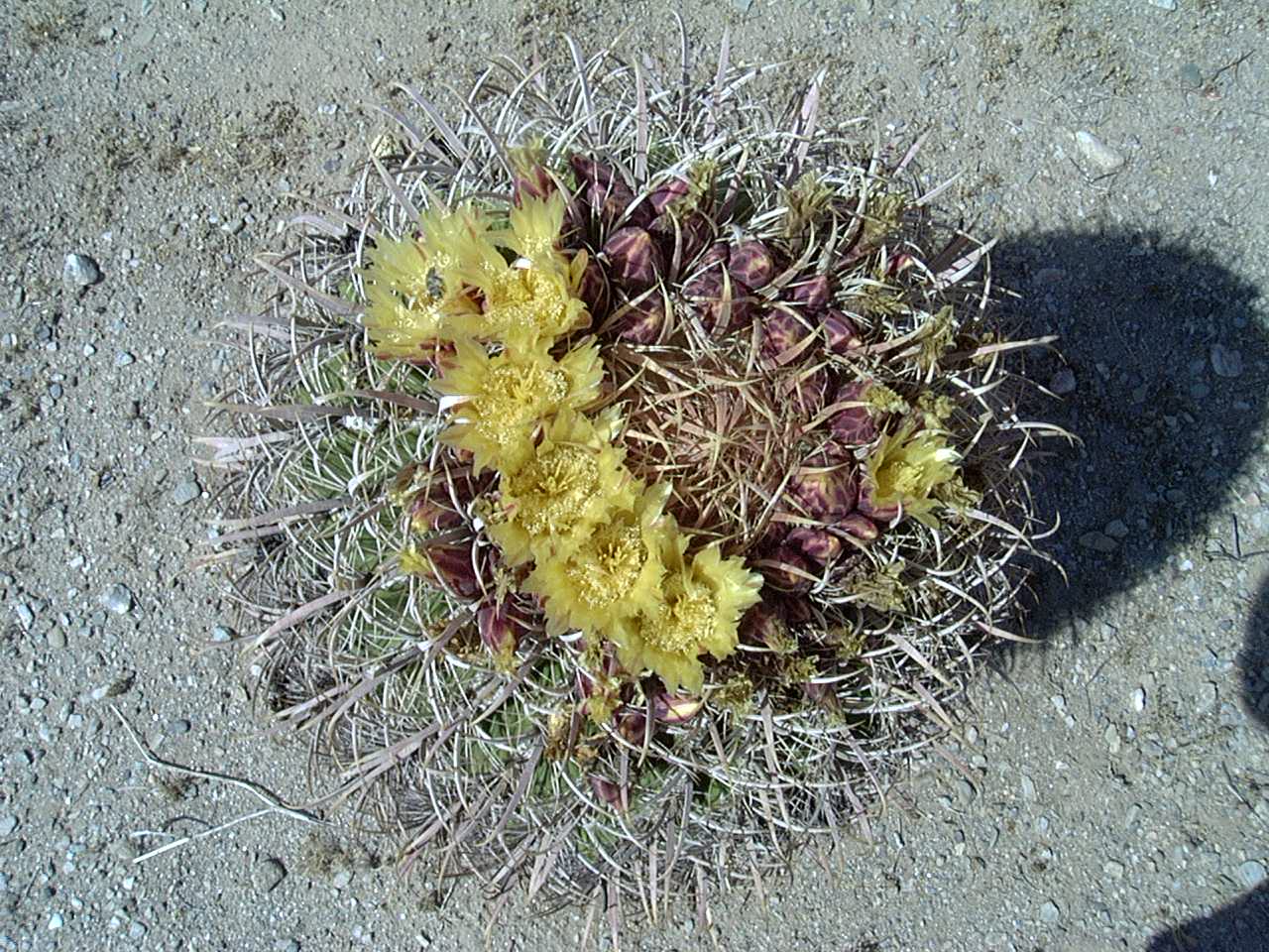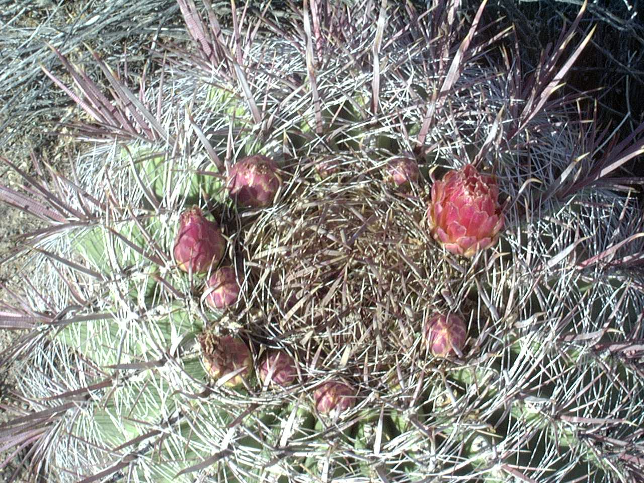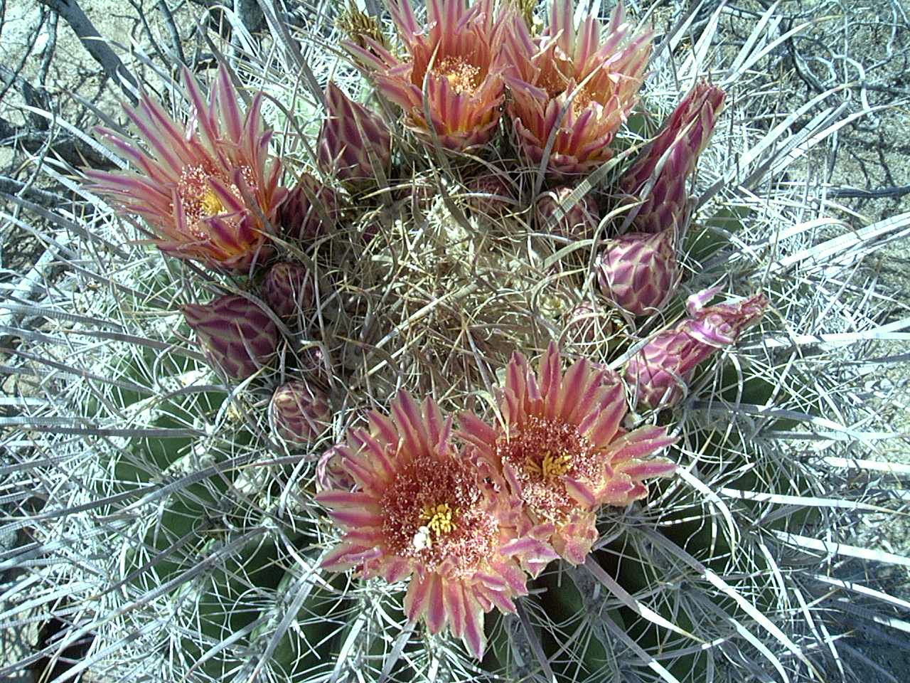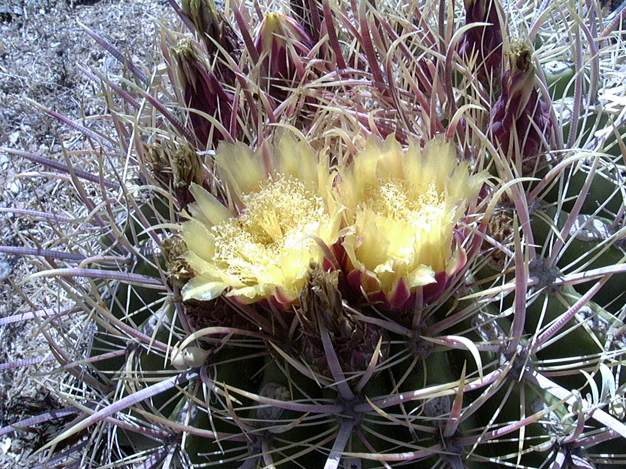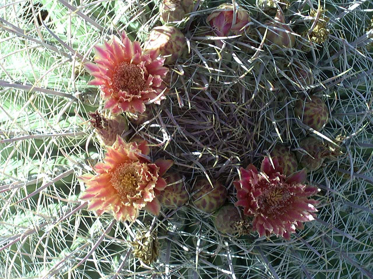 The rainbow barrel cacti are flowering again. Here's several views of one near my camp.