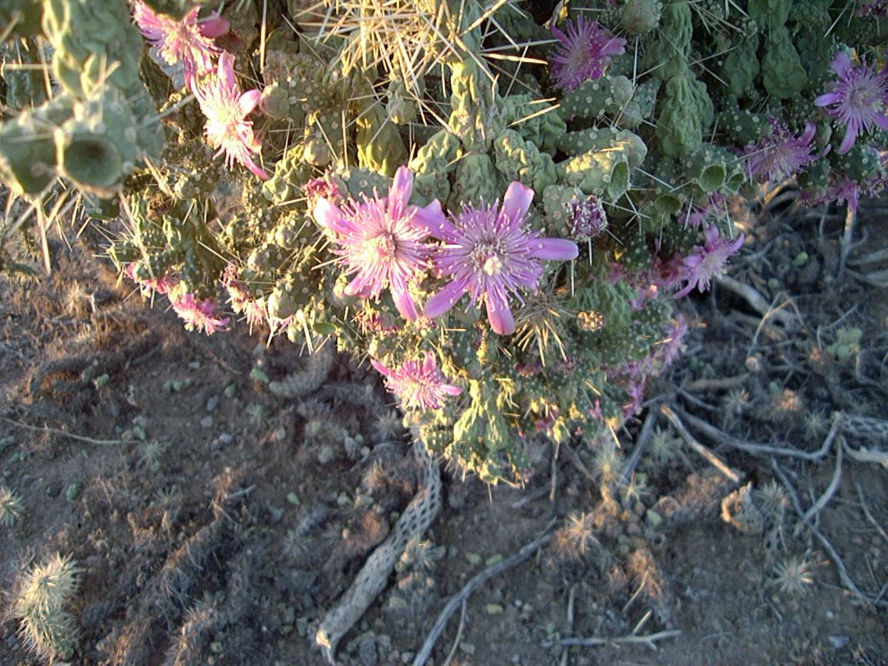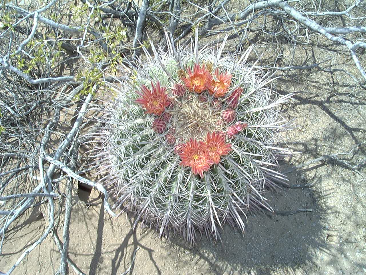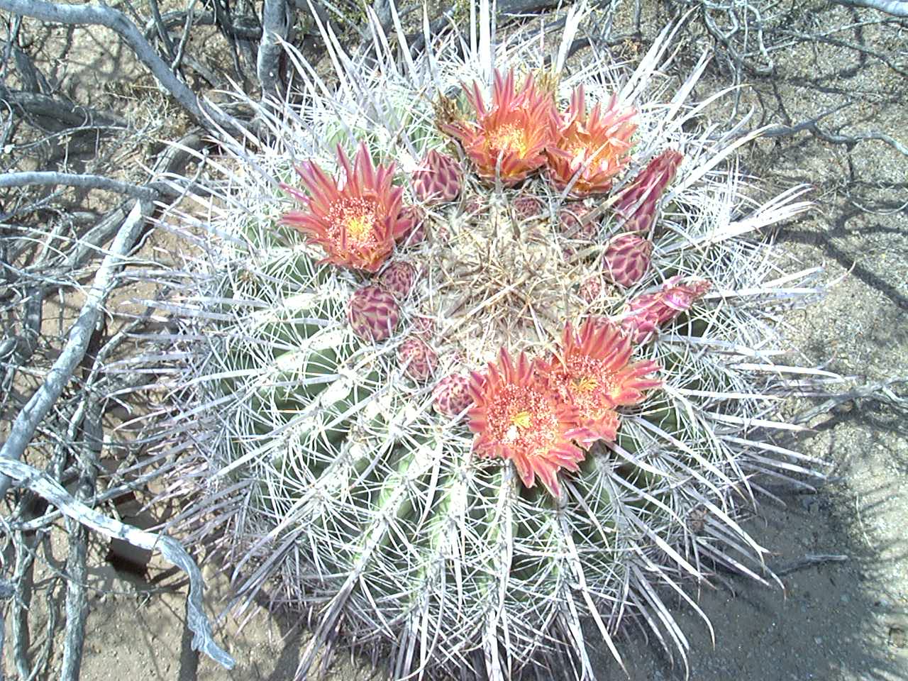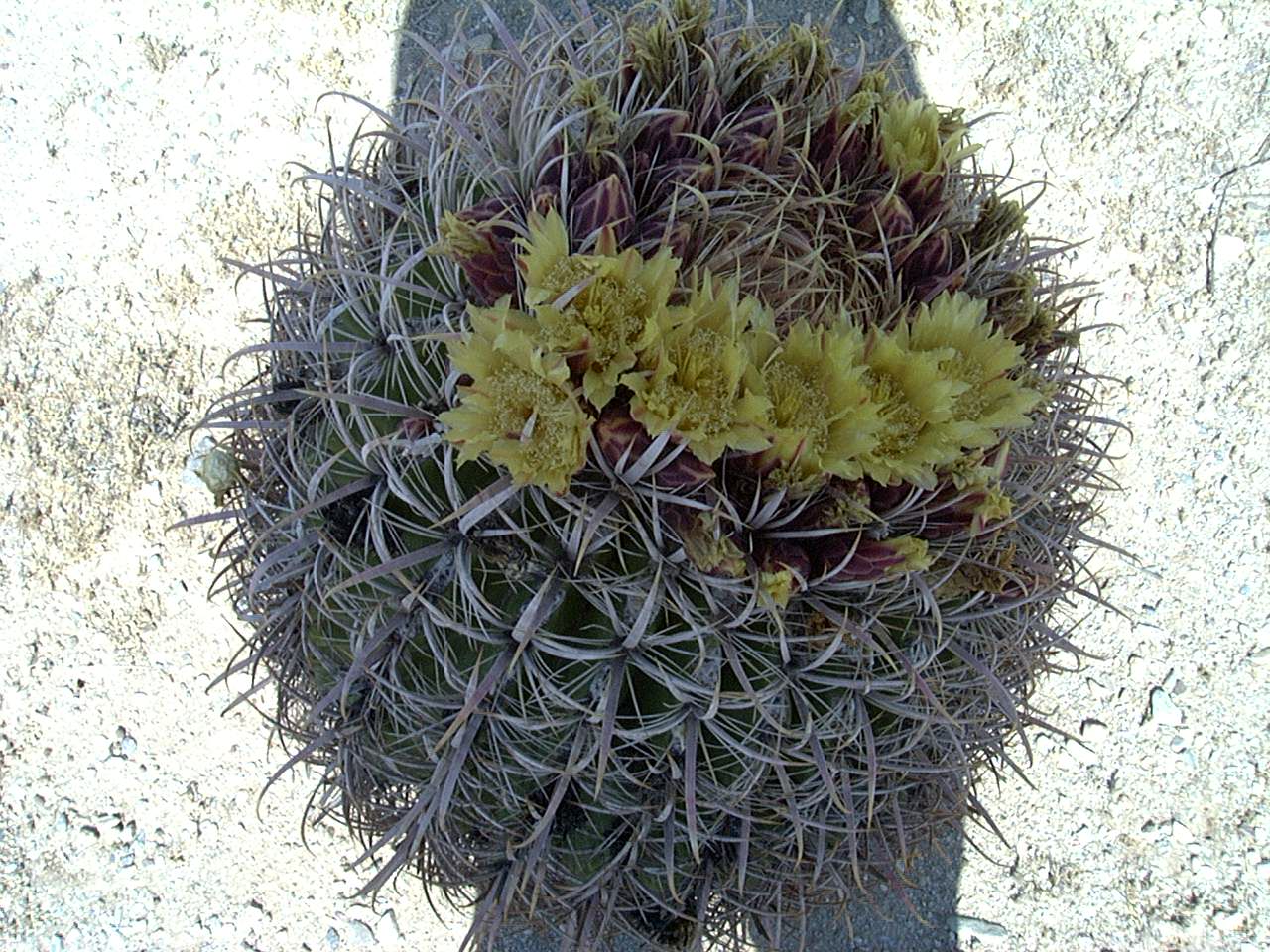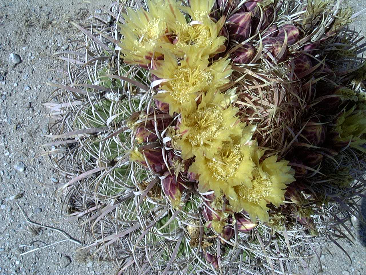 The rainbow barrel cacti are flowering again. Here's several views of one near my camp.