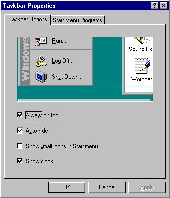 task bar pops up. Show small icons - Display icons small Show Clock - Clock appears in right task bar at bottom right. |